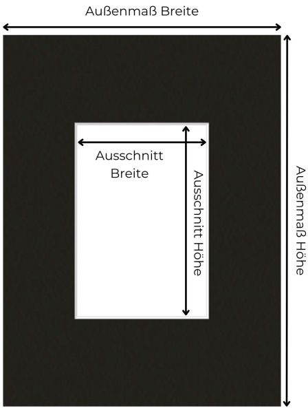 - Bitte beachte bei deiner Eingabe, dass dein Passepartout mind. 1 cm breit ist. (Bsp.: bei einem Außenmaß von 35x45 cm, darf das Bildmaß nicht größer als 33x43 cm sein.)